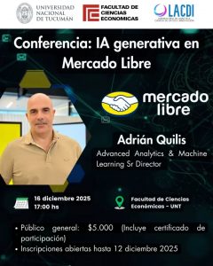 La Facultad de Ciencias Económicas de la UNT, junto al Laboratorio de Analítica, Ciencia de Datos e Innovación (LACDI), invita a profesionales, estudiantes, emprendedores y entusiastas de los datos a participar de la conferencia: “IA generativa en Mercado Libre”, que estará a cargo del disertante Adrián Quilis, Advanced Analytics & Machine Learning Sr Director – Mercado Libre.