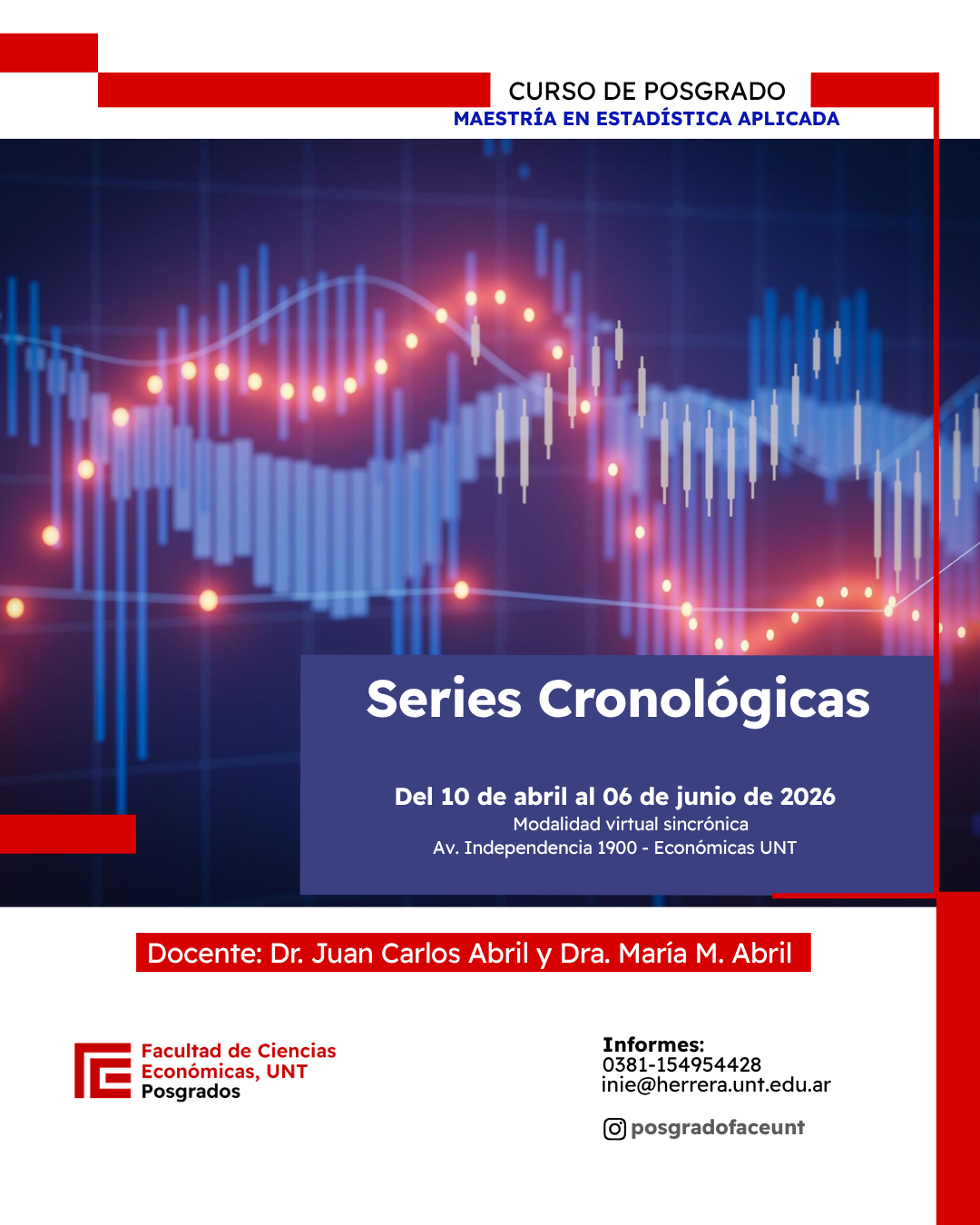 Del 10 de abril al 06 de junio de 2026 se dictará en nuestra Facultad de Ciencias Económicas de la UNT el curso con crédito para posgrado «Series Cronológicas», en el marco de la Maestría en Estadística Aplicada de esta casa de estudios.