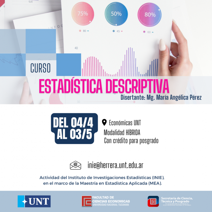 Del 4 de abril al 3 de mayo de 2025 se realizará en nuestra Facultad de Ciencias Económicas de la UNT el curso “Estadística Descriptiva”, a cargo de la Mg. María Angélica Pérez, con la colaboración de la Lic. Luciana Raquel Castillo.