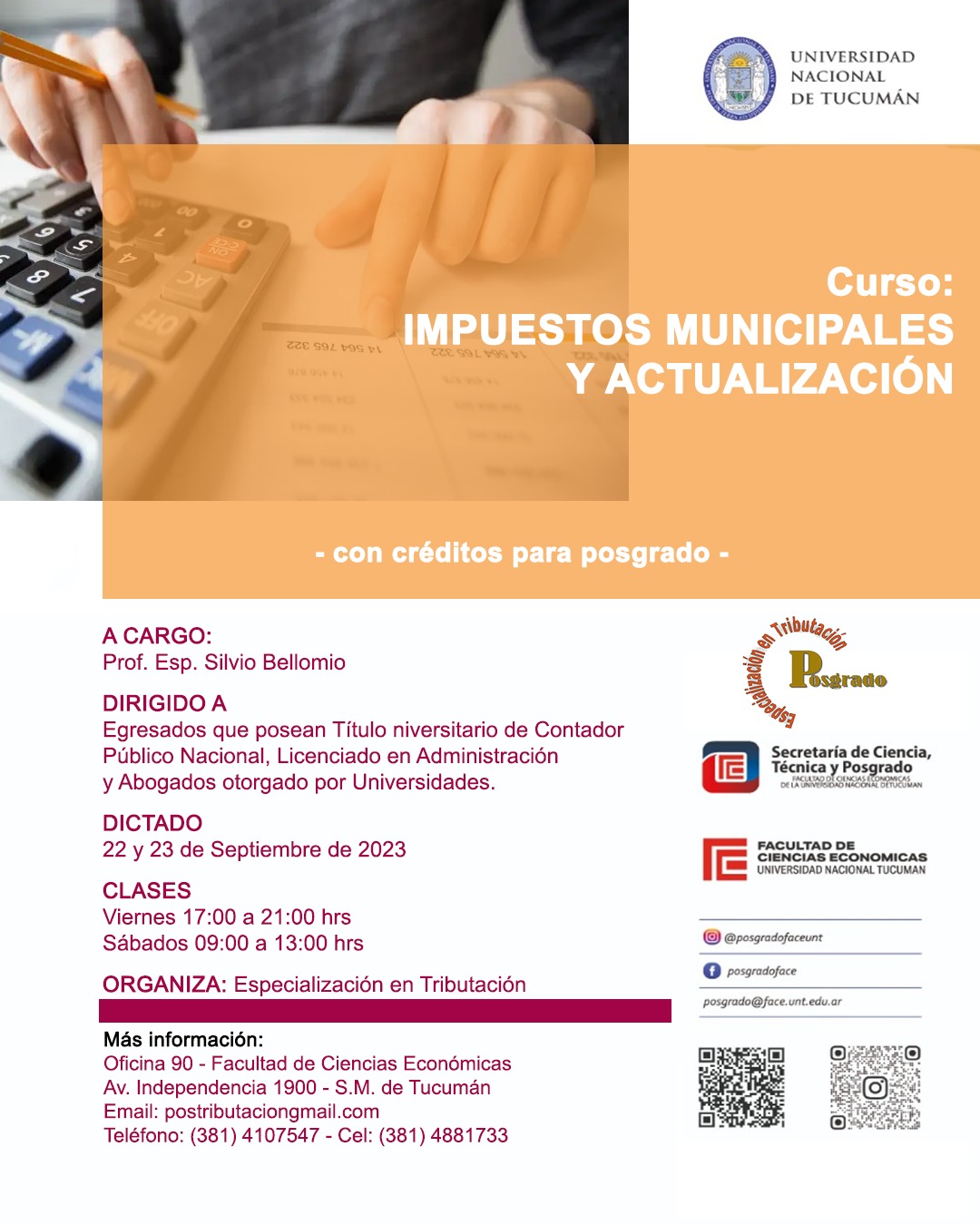 El 22 y 23 de septiembre se realizará en nuestra Facultad de Ciencias Económicas el Curso con crédito para posgrado “Impuestos Municipales y Actualización”, la actividad se desarrolla en el marco de la Especialización en Tributación. Estará a cargo del profesor Esp. Silvio Bellomio.