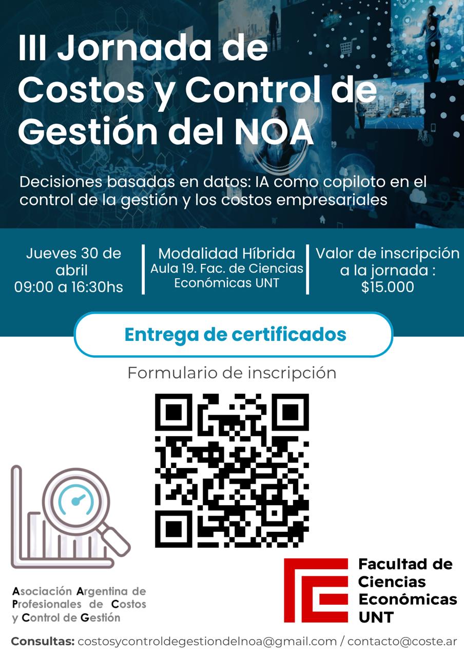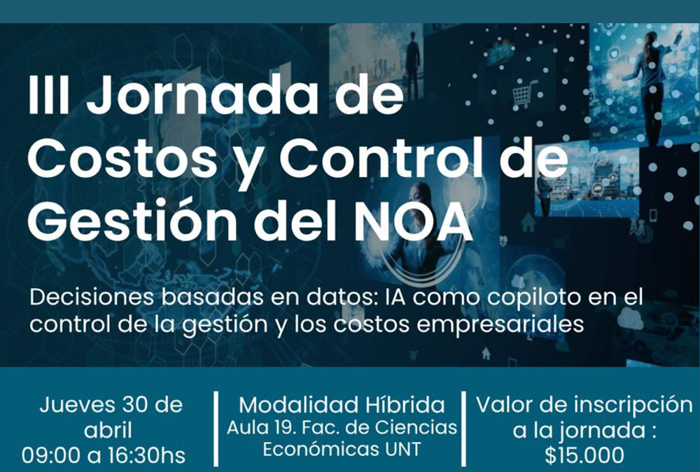 Nuestra Facultad de Ciencias Económicas será sede de la «III Jornada de Costos y Control de Gestión del NOA. Decisiones basadas en datos: IA como copiloto en el control de la gestión y los costos empresariales«, organizada por la Asociación Argentina de Profesionales de Costos y Control de Gestión en conjunto con la cátedra de Costos de nuestra Facultad.