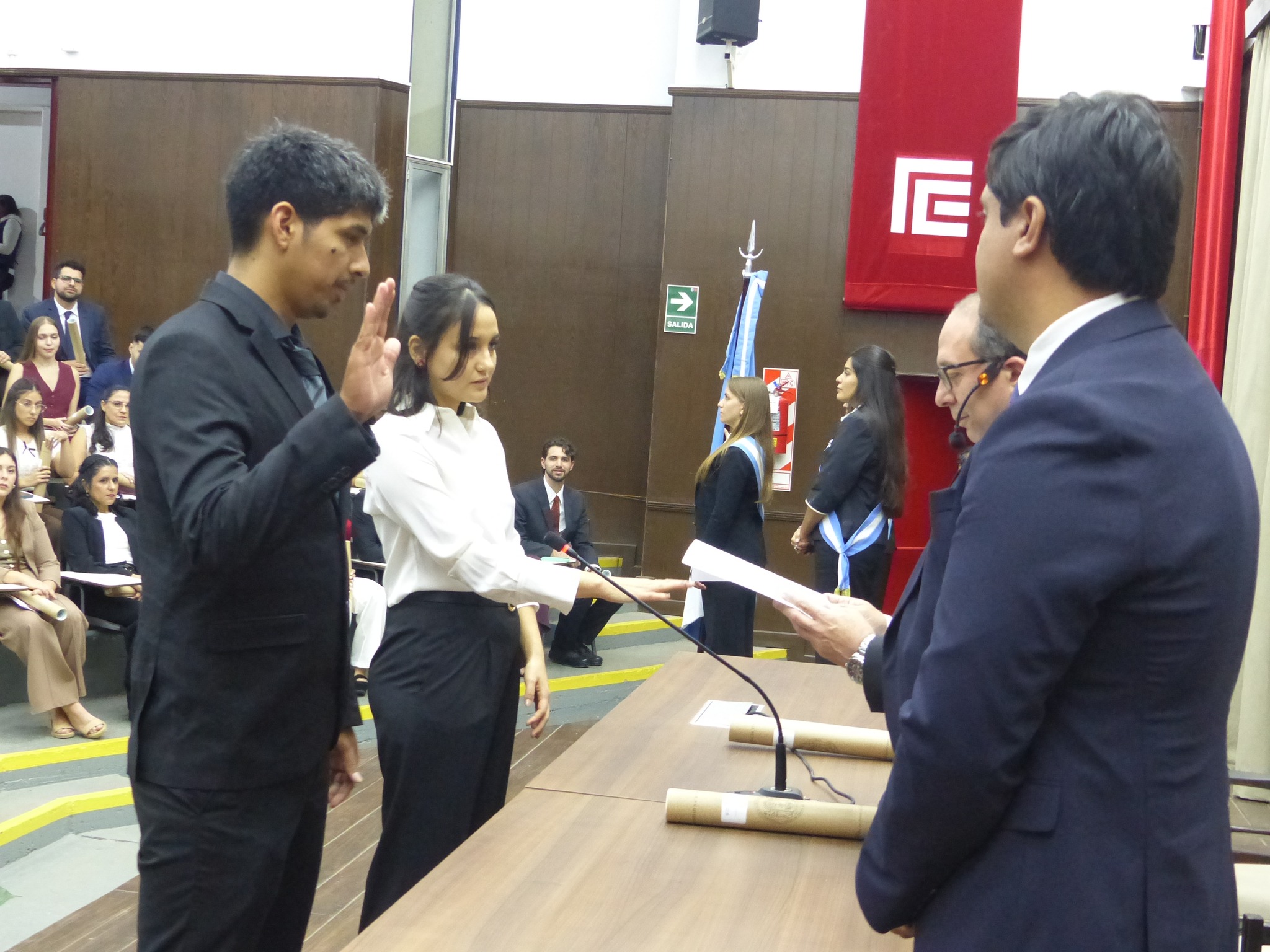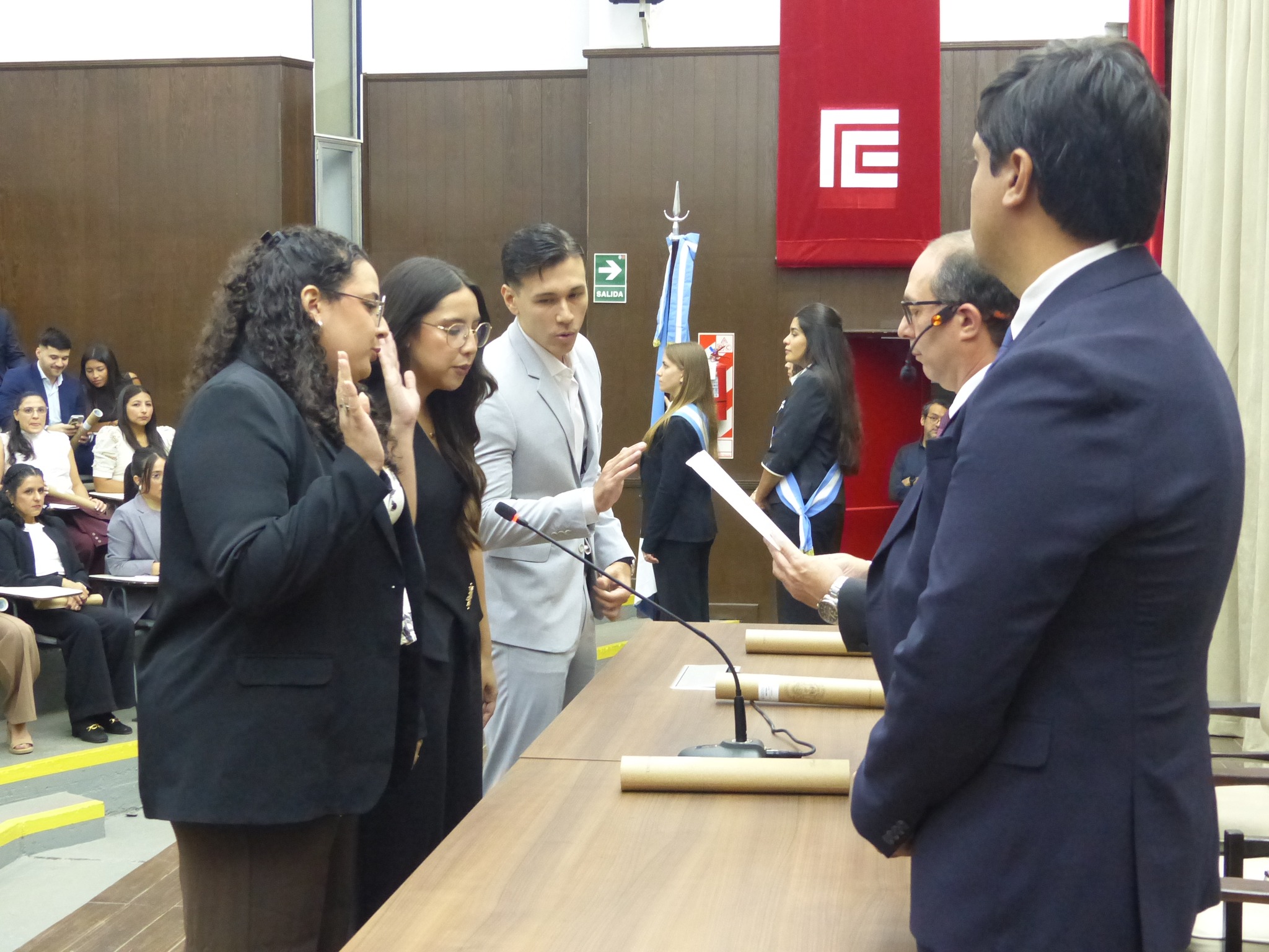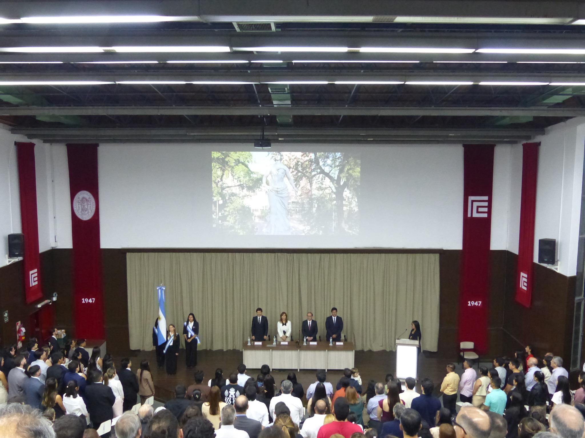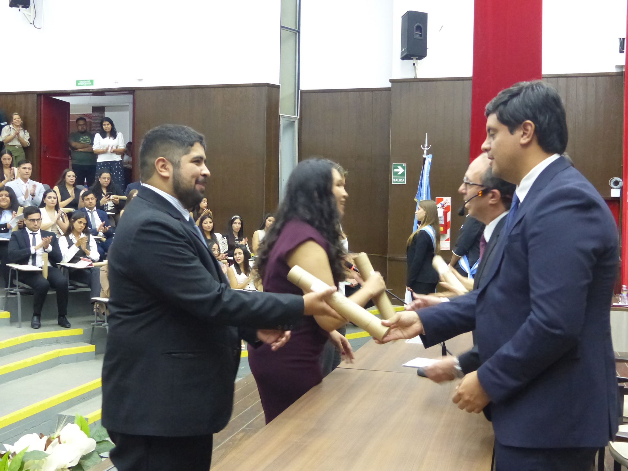 La ceremonia estuvo presidida por el decano de esta Casa de Estudios, Mg. Jorge Rospide, quien estuvo acompañado en el estrado por la secretaria académica, Mg. Liliana Pacheco; el secretario administrativo, Lic. Luis Pérez Vides y el subsecretario académico, Mg. Patricio Cossio.