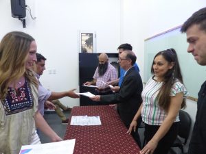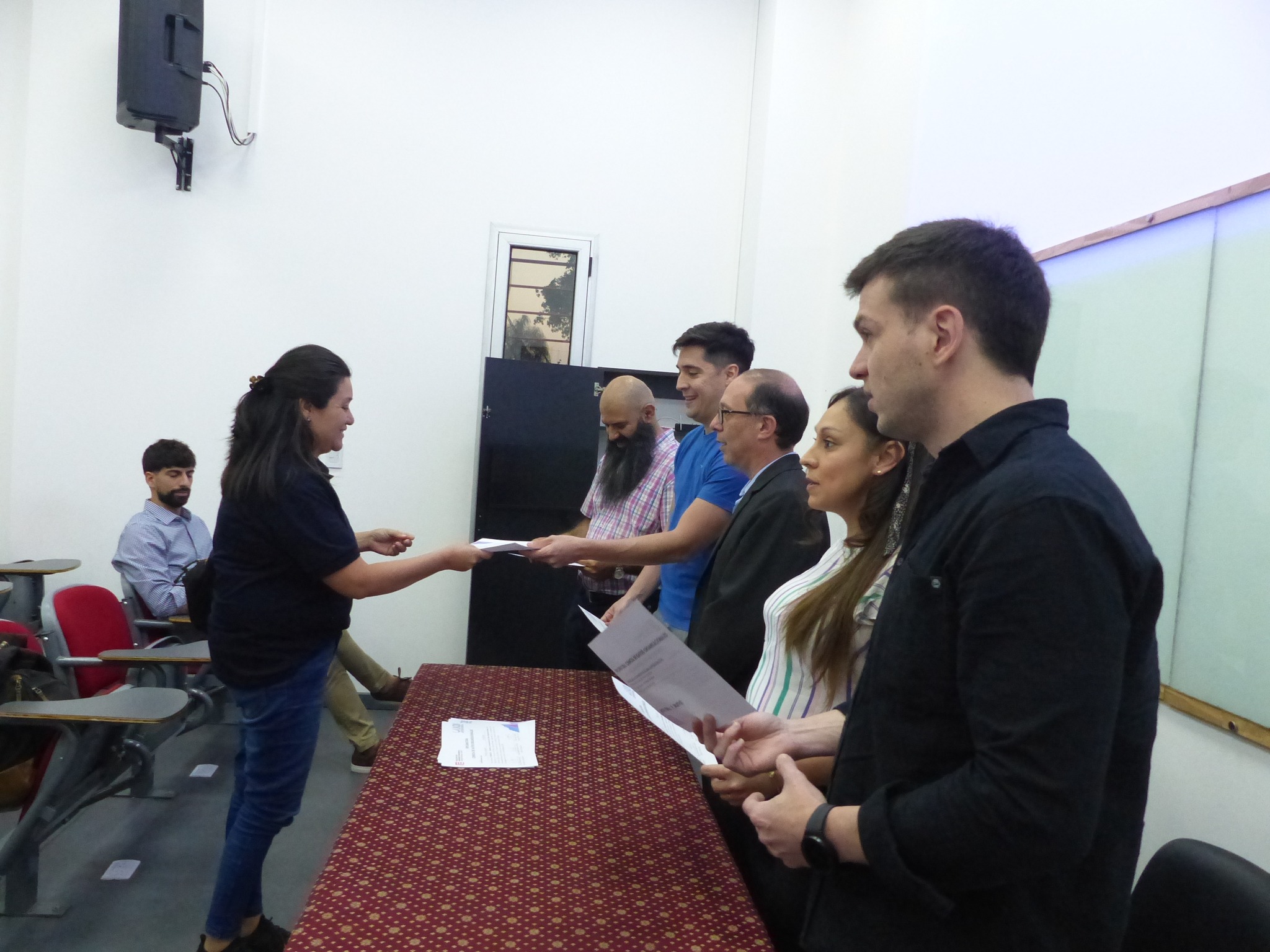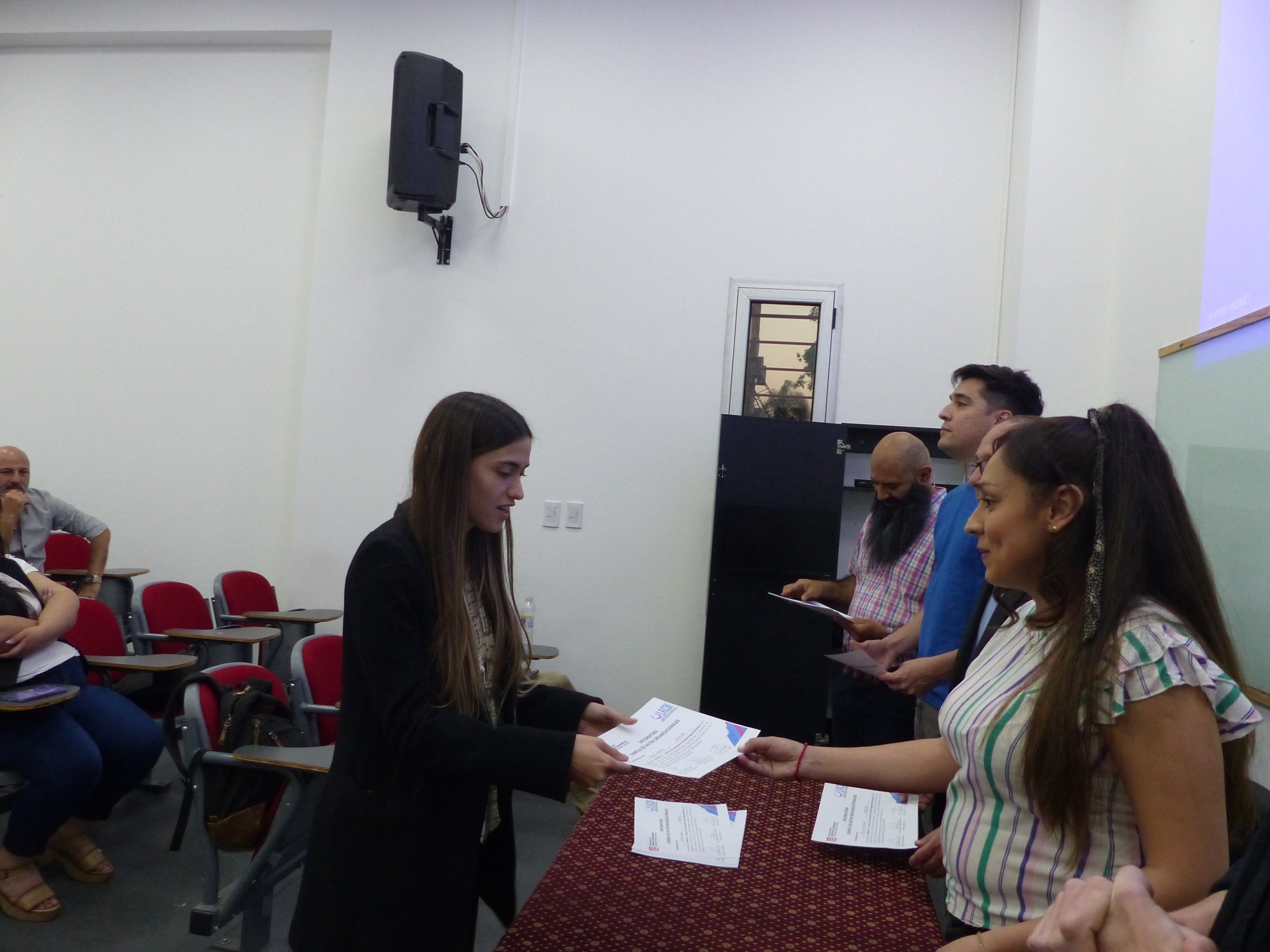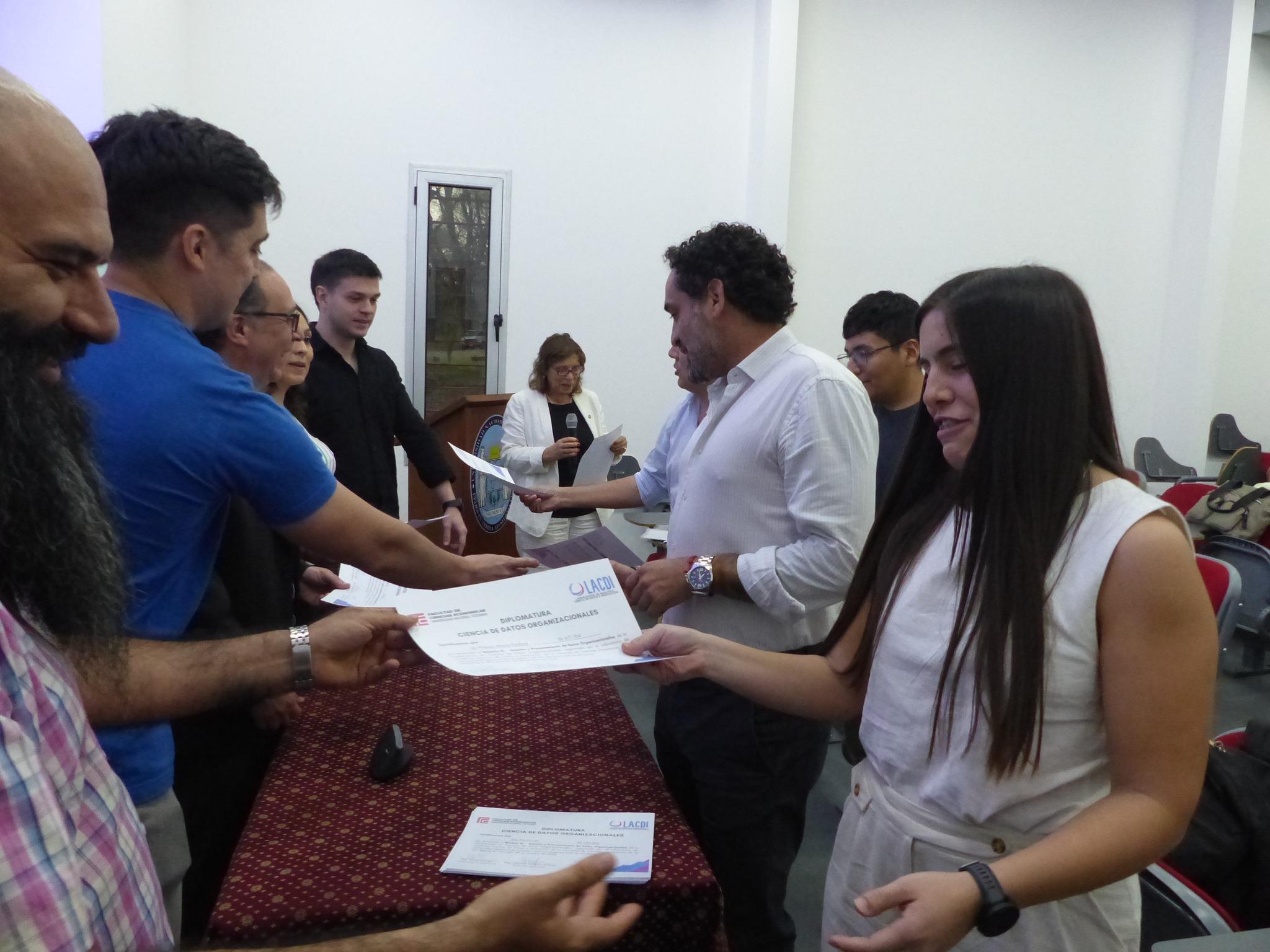 El acto estuvo encabezado por el decano, Mg. Jorge Rospide; el director ejecutivo del LACDI, Esp. Marcelo Medina Galván y la directora académica del LACDI, Mg. Christine Isgro. Además, la entrega de certificados contó con la participación de los docentes de la diplomatura: el Lic. Franco Bertinatti, profesor del módulo SQL, el Lic. Maximiliano Rivadeneira y la Ing. Edith Segura del módulo Phyton.