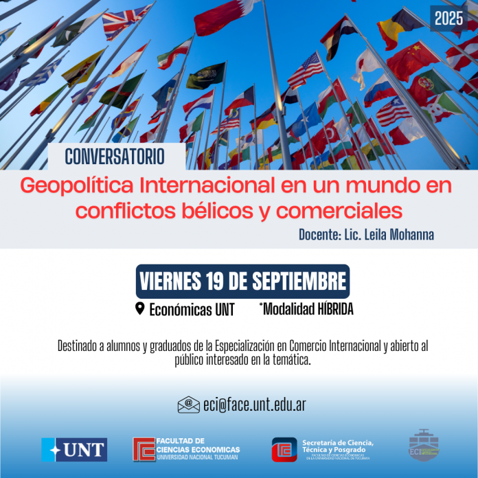 El viernes 19 de septiembre se llevará a cabo en nuestra Facultad de Ciencias Económicas de la UNT, el Conversatorio “Geopolítica Internacional en un mundo en conflictos bélicos y comerciales”, a cargo de la Lic. Leila Mohanna.