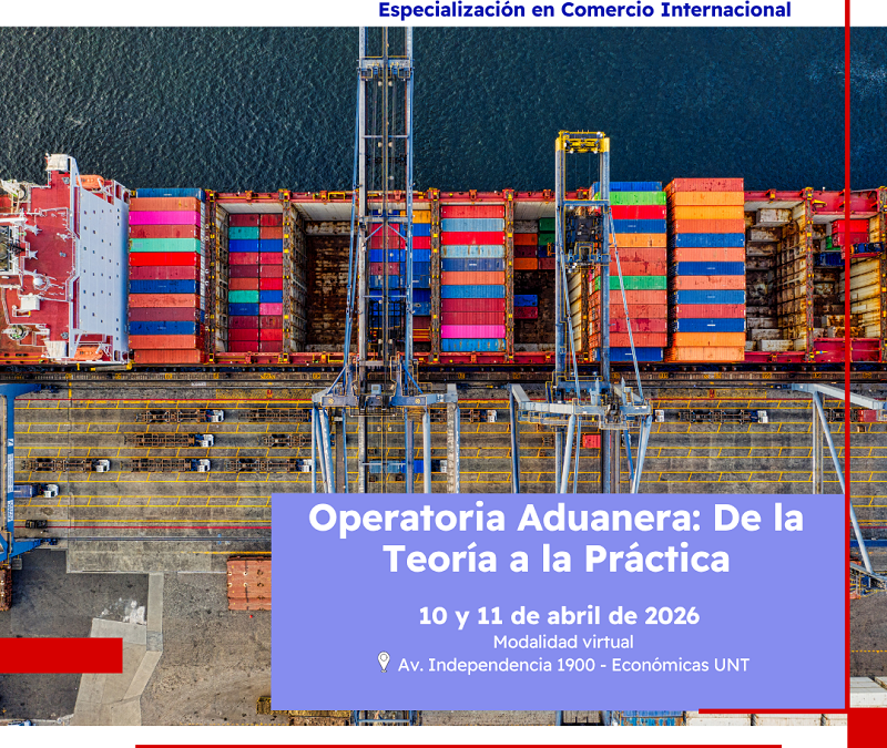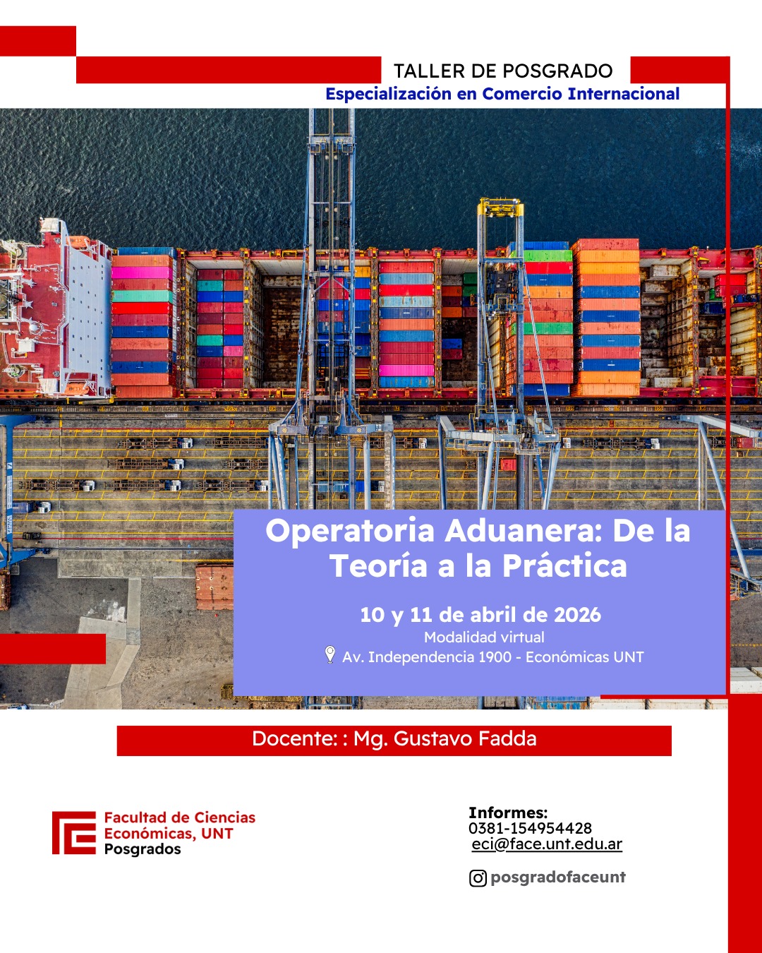 Los días viernes 10 y sábado 11 de abril de 2026 se llevará a cabo en nuestra Facultad de Ciencias Económicas de la UNT, el Taller de la Especialización en Comercio Internacional “Operatoria Aduanera: De la Teoría a la Práctica”, a cargo del Mg. Gustavo Fadda.