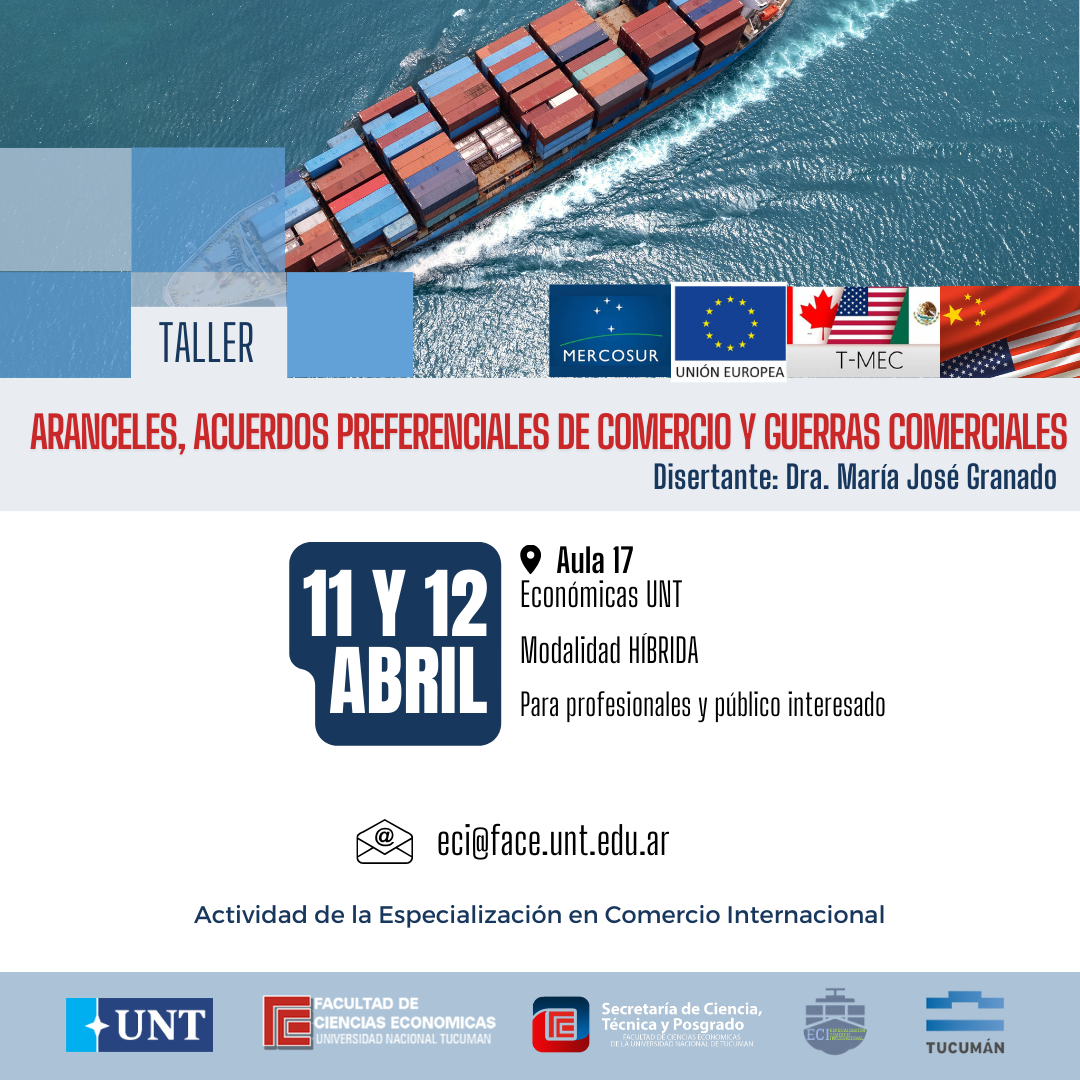 Los días viernes 11 y sábado 12 de abril se llevará a cabo en nuestra Facultad de Ciencias Económicas de la UNT, el Taller de la Especialización en Comercio Internacional “Aranceles, Acuerdos Preferenciales de Comercio y Guerras Comerciales”, a cargo de la Dra. María José Granado.