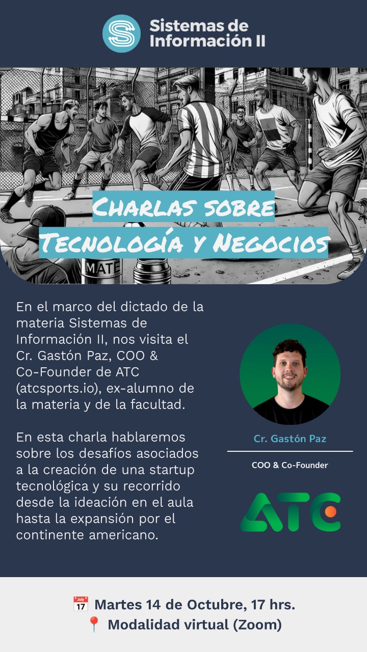 En el marco del dictado de la materia Sistemas de Información II, nos visita el Cr. Gastón Paz, COO & Co-Founder de ATC (atcsports.io), ex-alumno de la materia y de la facultad.