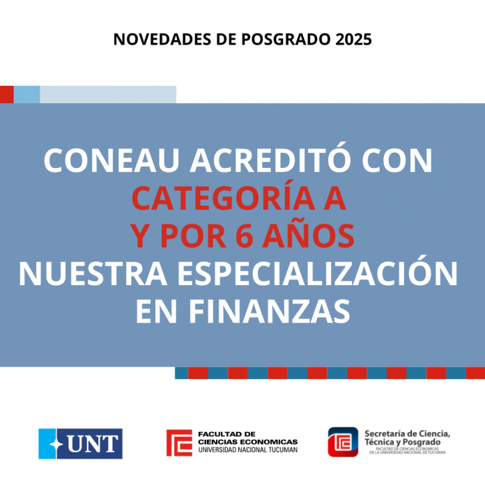 La Comisión Nacional de Evaluación y Acreditación Universitaria (CONEAU) otorgó la acreditación por seis años, con Categoría A, a la carrera de posgrado Especialización en Finanzas que dicta la Facultad de Ciencias Económicas de la Universidad Nacional de Tucumán.