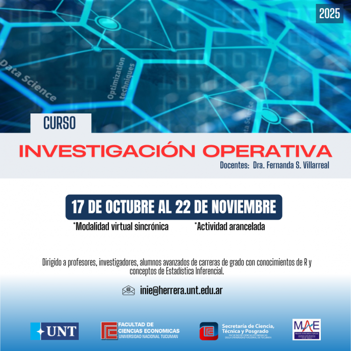 Del 17 de octubre al 22 de noviembre de 2025 se dictará en la Facultad de Ciencias Económicas de la UNT el curso con crédito para posgrado “Investigación Operativa”, en el marco de la Maestría en Estadística Aplicada de esta Casa de Estudios.